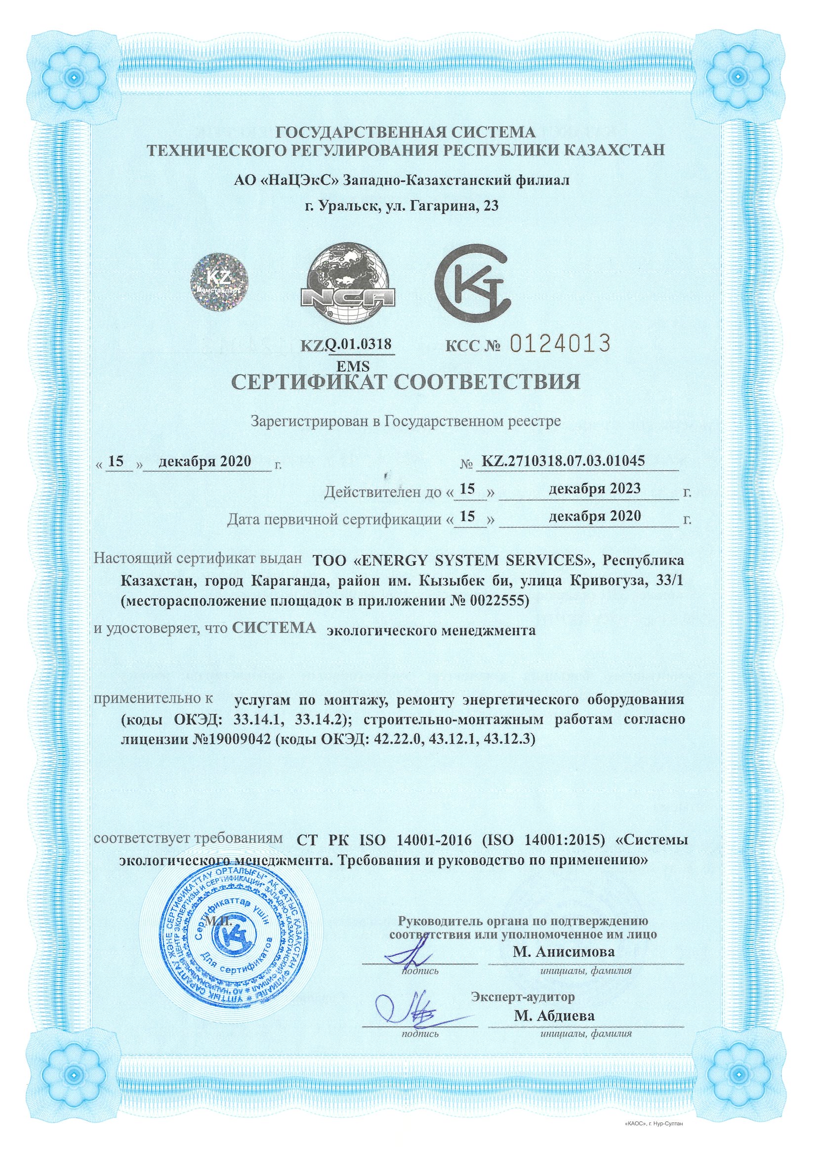 Following the results of audits in quality, environment and safety management systems carried out in Q4 2020, Energy System Services LLP was recognized as complying with the requirements of international standards such as ISO and OHSAS. The company is certified with ST RK ISO 9001-2016 (ISO 9001:2015) Quality Management Systems, ST RK OHSAS 18001-2008 (OHSAS 18001:2007) Occupational Health and Safety Assessment Series and ST RK ISO 14001-2016 (ISO 14001:2015) Environmental Management System. Requirements with guidance for use.